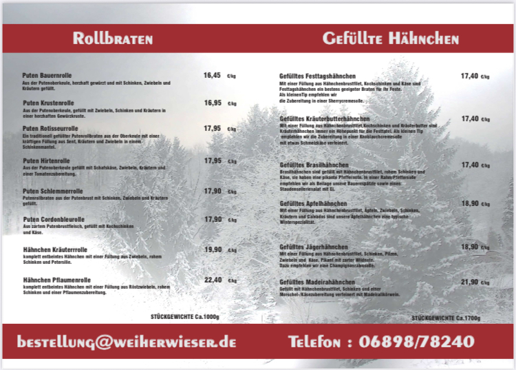Unsere Produkte für die "geflügelten Festtage" reichen von gefüllten Hähnchen, Hähnchen- oder Putenrollbraten bis hin zur gefüllten Putenbrust. Annahmeschluss der Vorbestellungen ist der 13.12.2025 12:00 Uhr.
