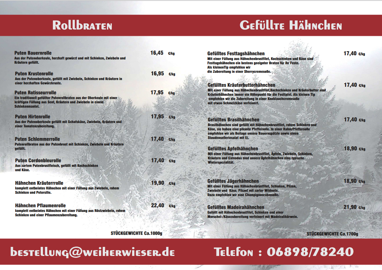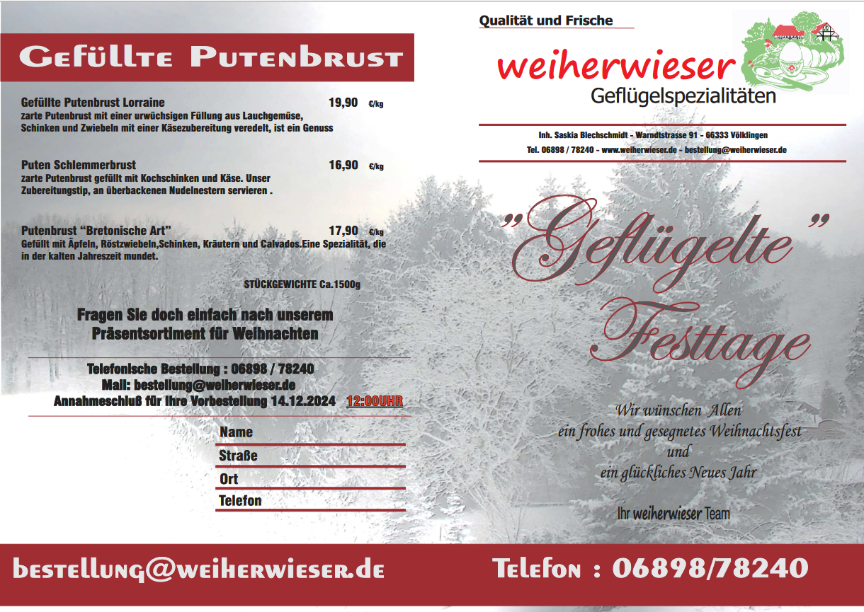 Unsere Angebote für die " Geflügelten Festtage" reichen von gefüllten Hähnchen, Putenrollbraten bis hin zur gefüllten Putenbrust. Annahmeschluss der Vorbestellungen ist der 14.12.2024 um 12:00 Uhr.