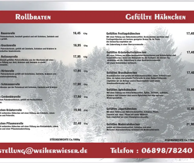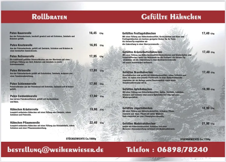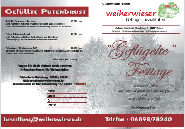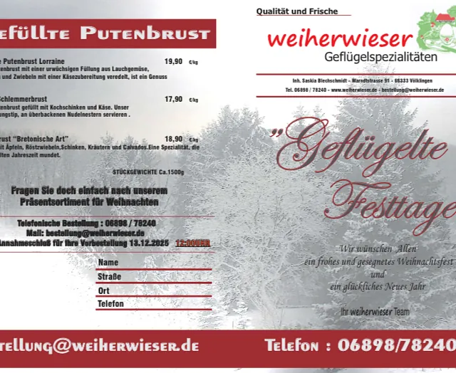 Unsere Produkte für die "geflügelten Festtage" reichen von gefüllten Hähnchen, Hähnchen- oder Putenrollbraten bis hin zur gefüllten Putenbrust. Annahmeschluss der Vorbestellungen ist der 13.12.2025 12:00 Uhr.